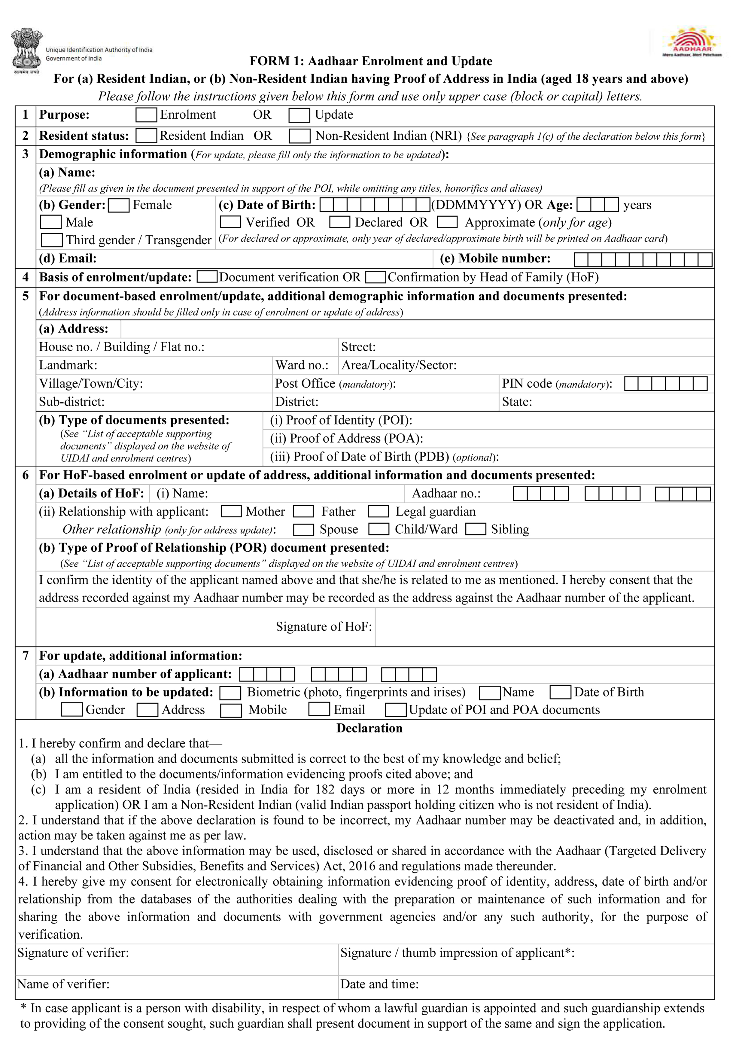 Aadhaar Form 1 : Mobile & Email Update